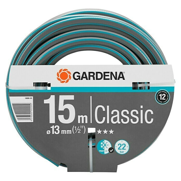 De drukbestendige GARDENA Classic slang is vormvast door het gebruik van hoogwaardig weefsel en is vrij van schadelijke weekmakers (ftalaten) en zware metalen en is natuurlijk UV-bestendig. Indien gewenst systematisch uit te breiden met Original GARDENA System koppelstukken en besproeiingsproducten. Kortom, de perfecte voorwaarden voor eenvoudig en flexibel gebruik in uw tuin. Barstdruk: 22 bar. Garantie: 12 jaar.