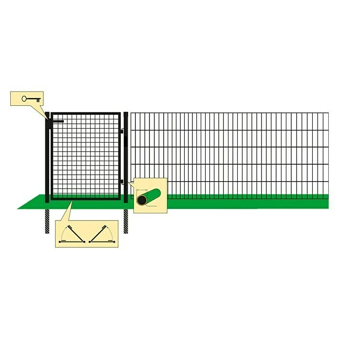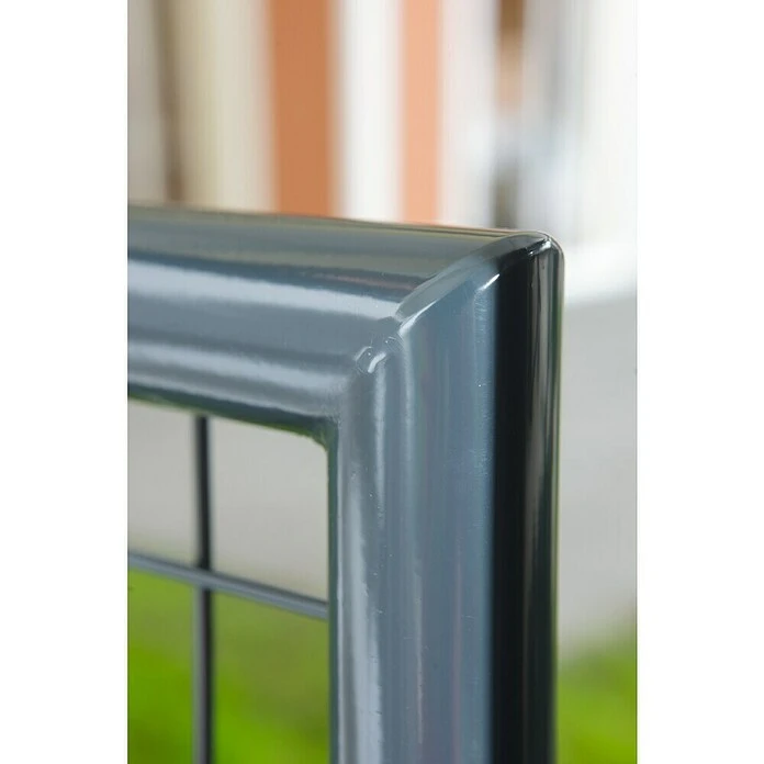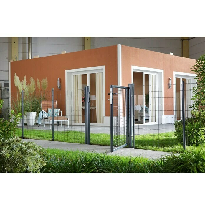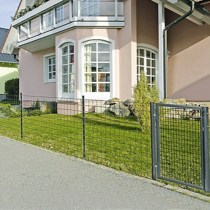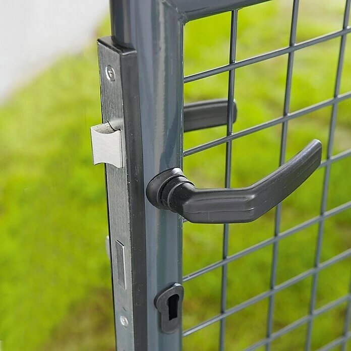 De thermisch verzinkte en gepoedercoate tuinpoort is de passende aanvulling op het gelaste hekwerk. De bijbehorende palen (ร 64 mm) voor een snelle en ongecompliceerde montage worden meegeleverd. Een slot met 3 sleutels is ook inbegrepen.