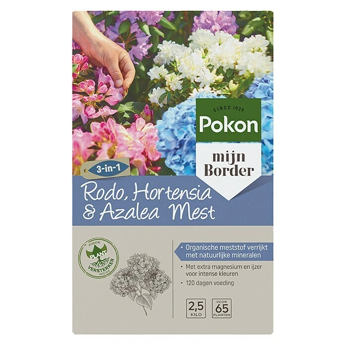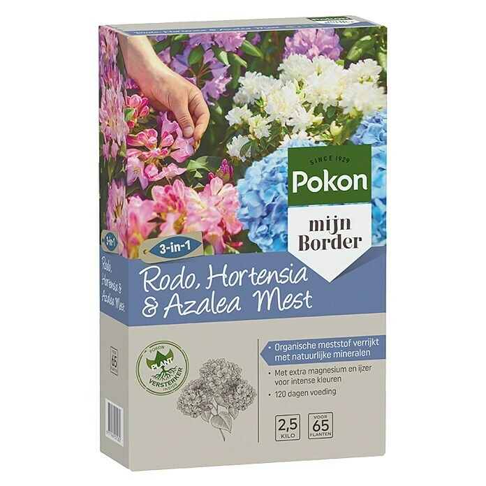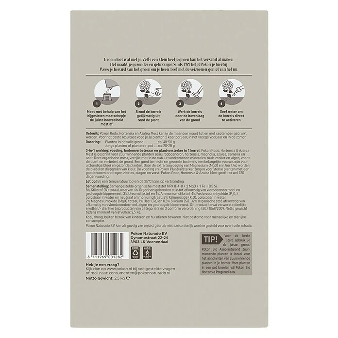 3-in-1 werking: voeding, bodemverbeteraar en plantversterker in 1 korrel. Pokon Rodo, Hortensia & Azalea Mest is geschikt voor zuurminnende planten zoals rododendron, hortensia, magnolia, azalea, camelia en acer. Deze organische mest, verrijkt met in de natuur voorkomende mineralen zoals zeoliet en algen, voedt de plant en verbetert de grond. Een goed bemeste en gezonde bodem is een belangrijke voorwaarde voor uitbundige bloei en gezonde planten. Door de extra toevoeging van Magnesium (Mg0) en IJzer (Fe) worden de bladeren diepgroen van kleur. De voeding en Pokon Plantenversterker zorgen voor sterke planten met een goede weerstand tegen ziektes, plagen en vorst. Pokon Rodo, Hortensia en Azalea Mest geeft tot wel 120 dagen voeding. Pokon Rodo, Hortensia & Azalea Mest kan in de maanden maart t/m september gebruikt worden. Voor het beste resultaat voed je je planten 2 keer per jaar, in het vroege voorjaar en in de zomer.